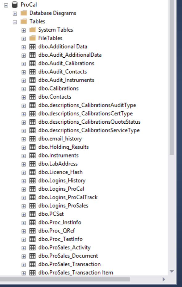 - In the navigation Pane on the left, click the small + next to databases and then click the + next to ProCal.