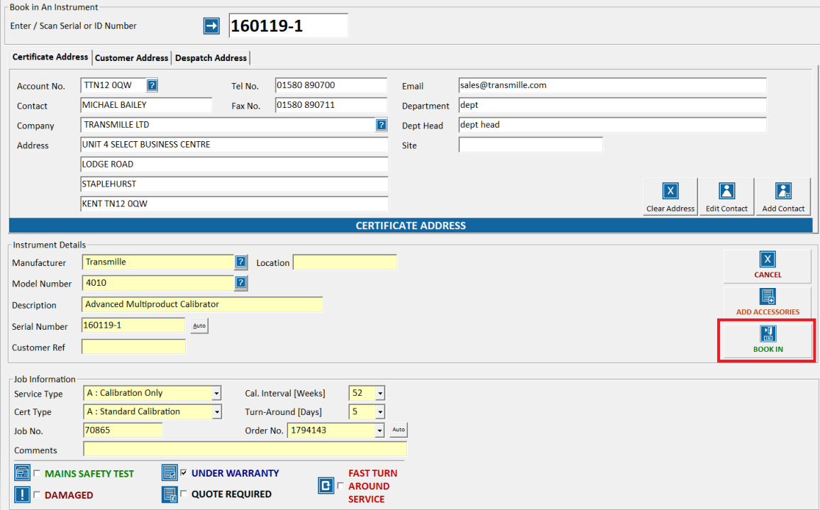 Once all required information has been entered, press the 'Book In' button to book the instrument into the system. If you are using a lower resolution screen, the book in button can be found on the 'Instrument Details' tab: